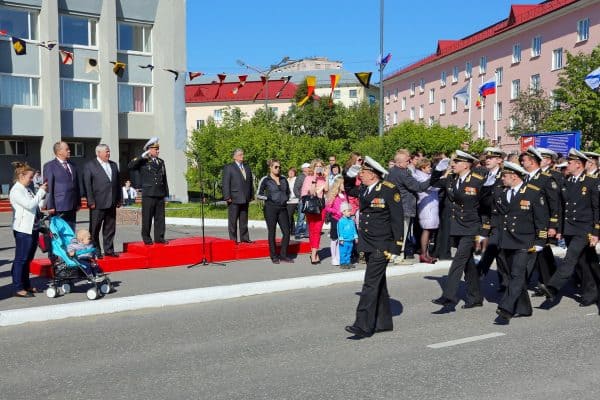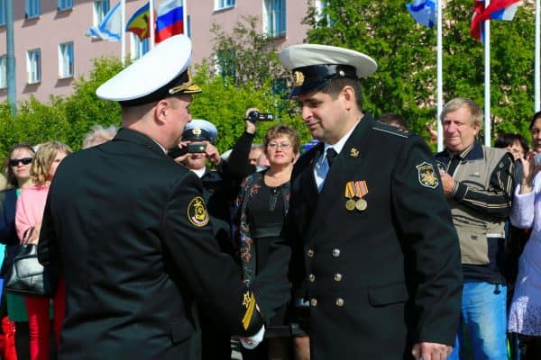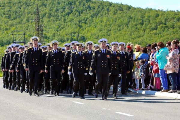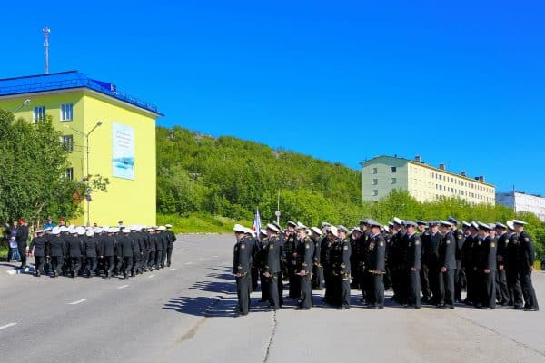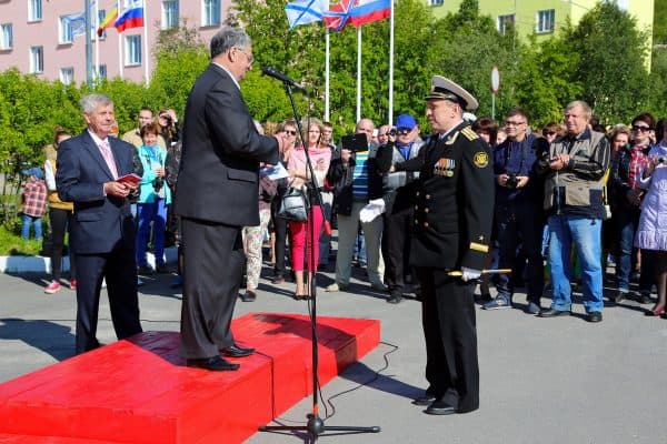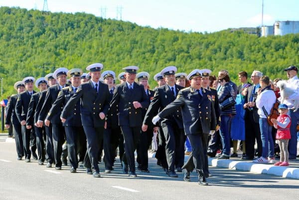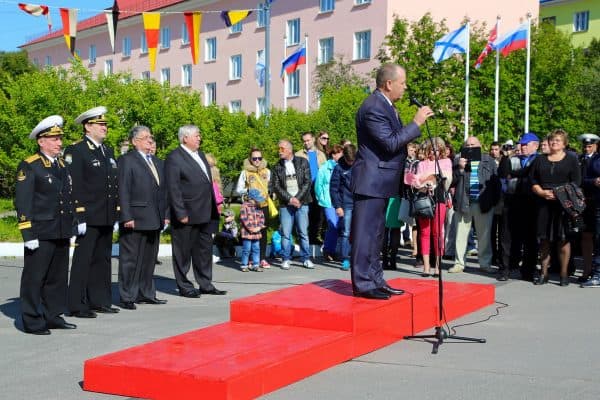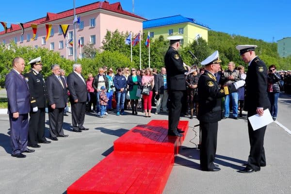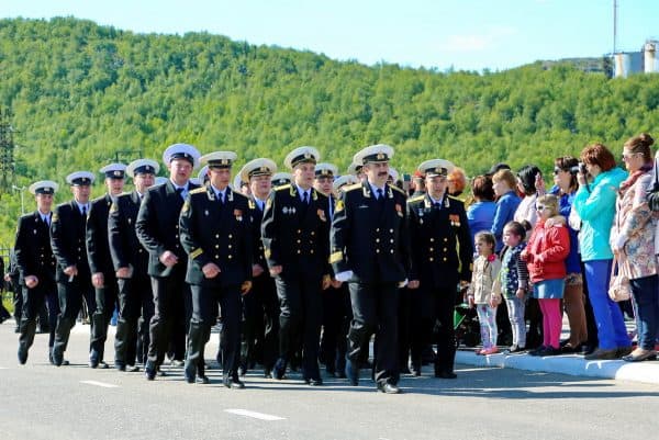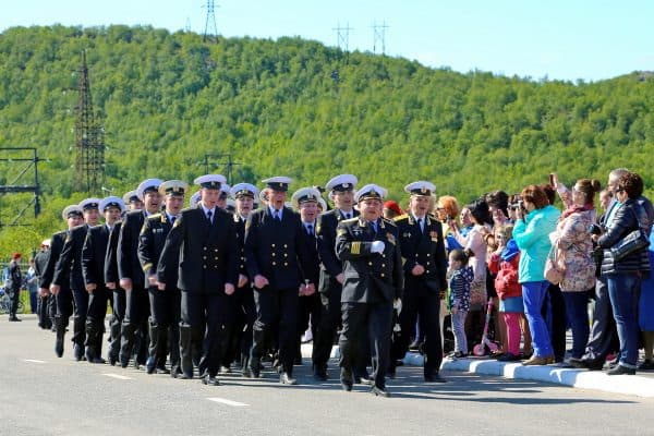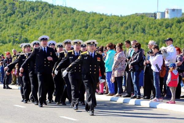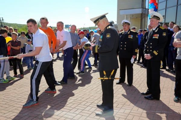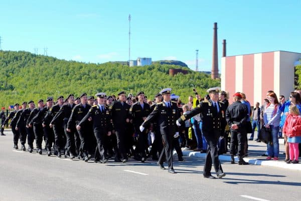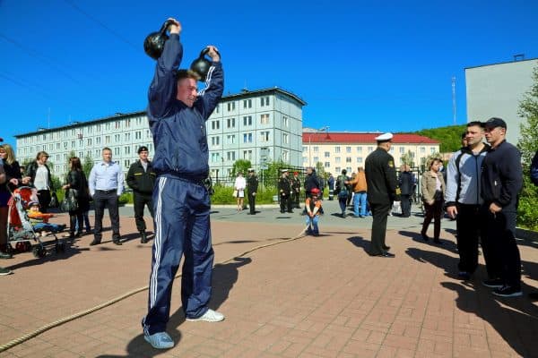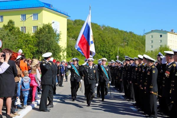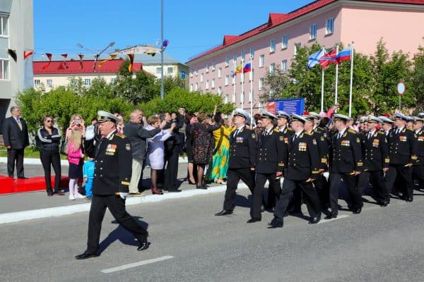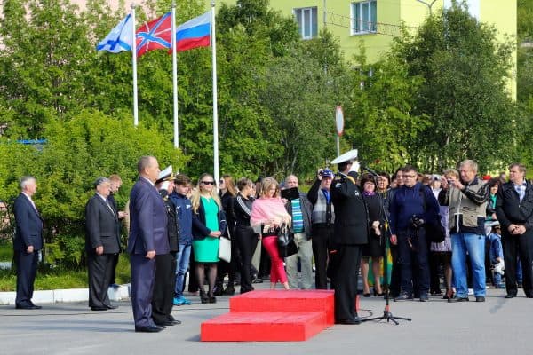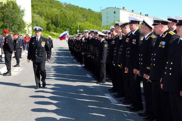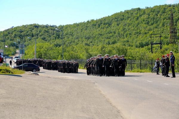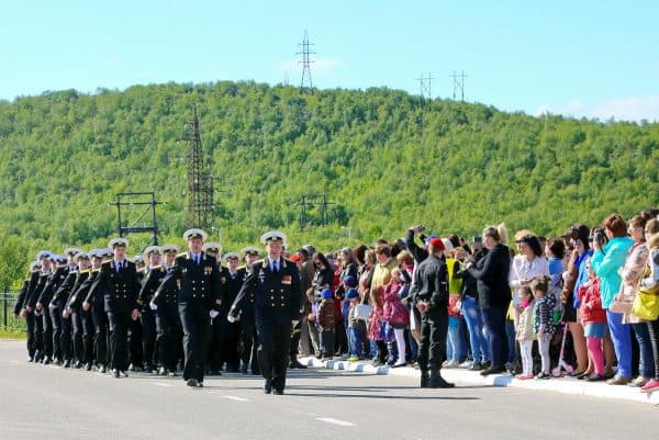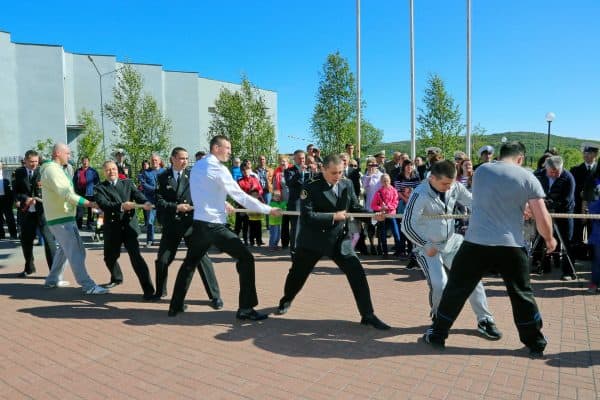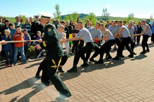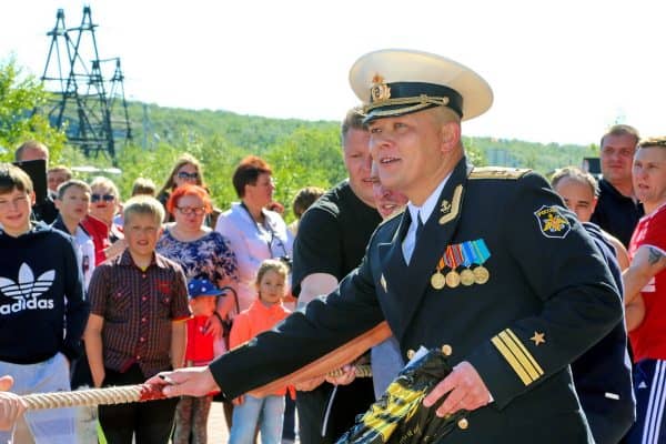 Фоторепортаж с празднования Дня ВМФ в Видяево 26 июля 2015 года — торжественное построение личного состава, посвящённое 50-летию 7-й дивизии АПЛ и Дню ВМФ, поздравления и награждения, конкурс по строевой подготовке и исполнению строевой песни, командные соревнования по перетягиванию каната и гиревому спорту, праздник Нептуна.