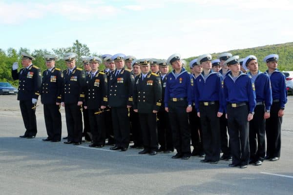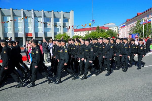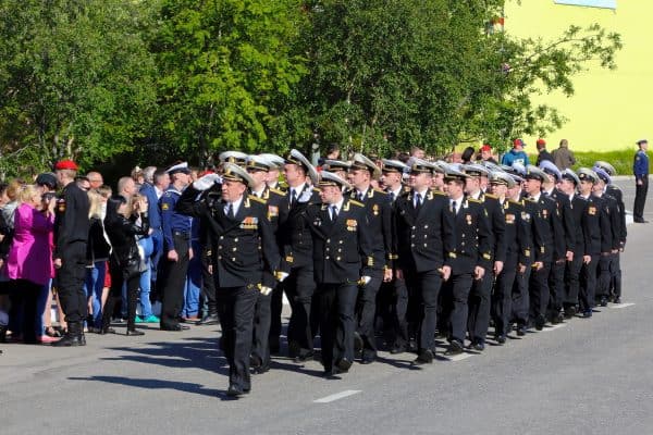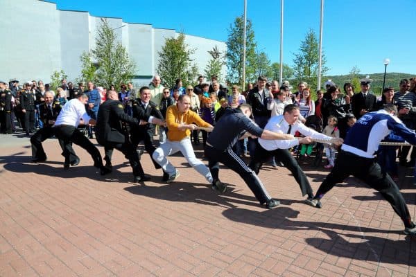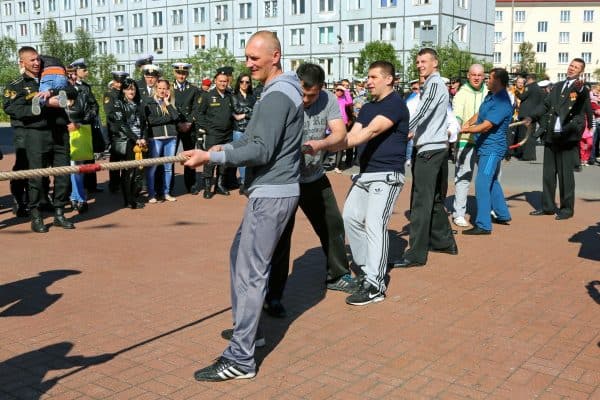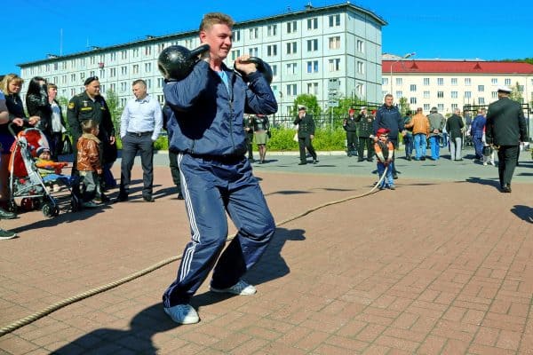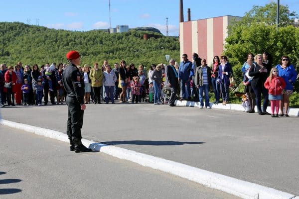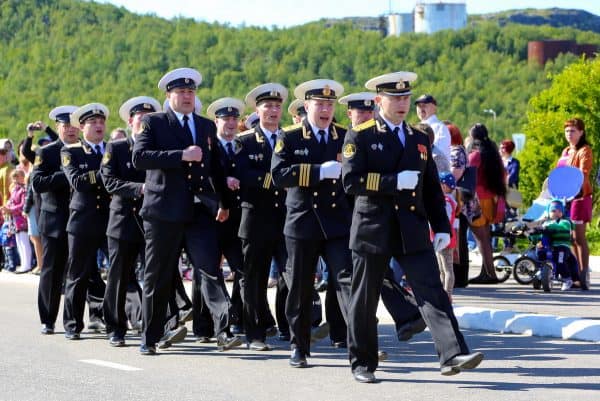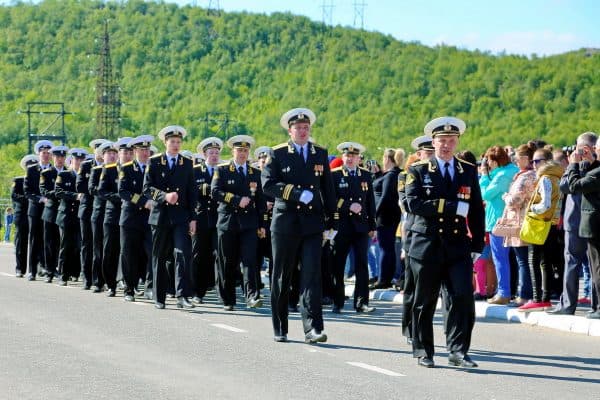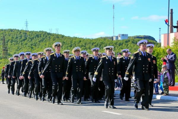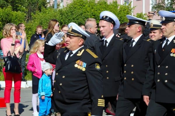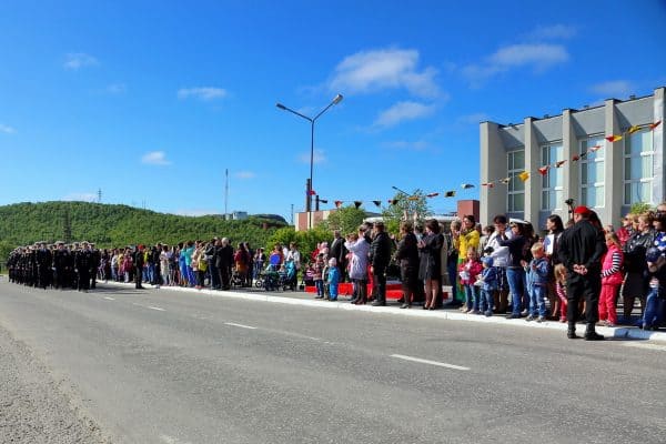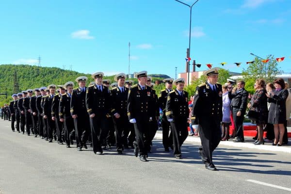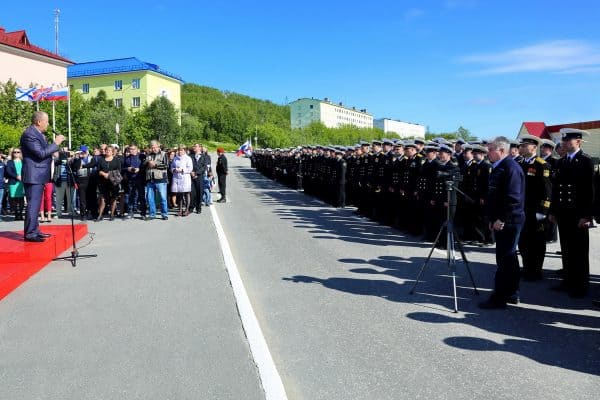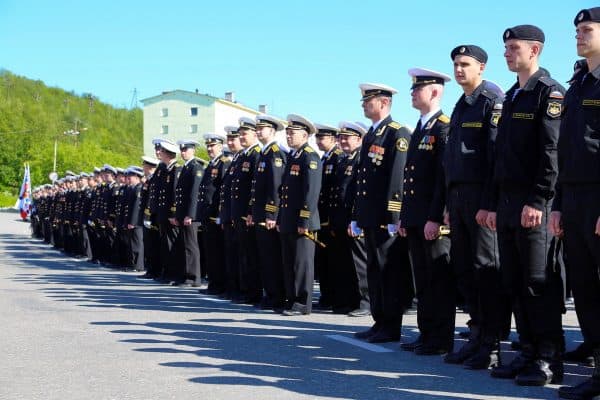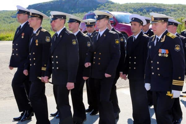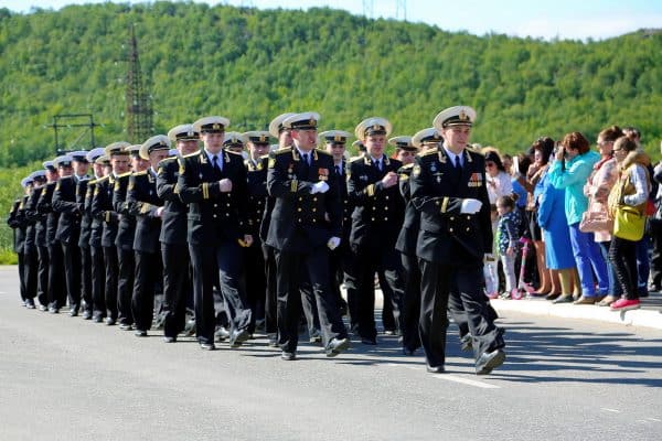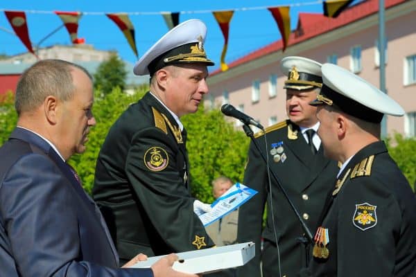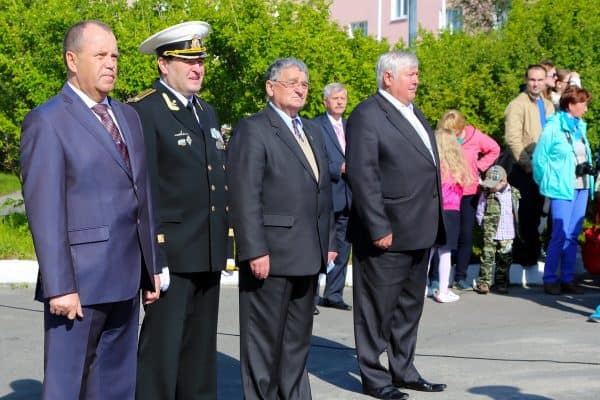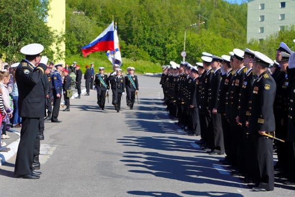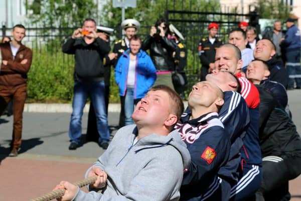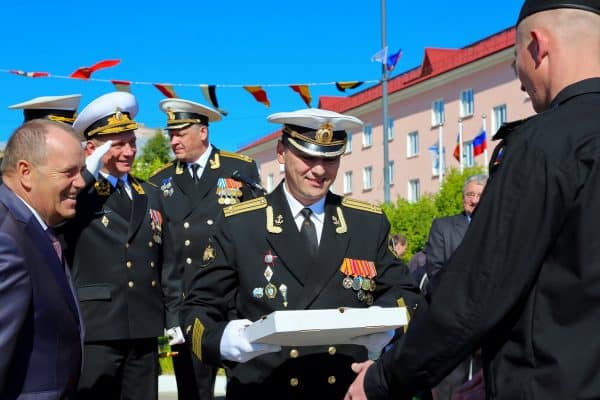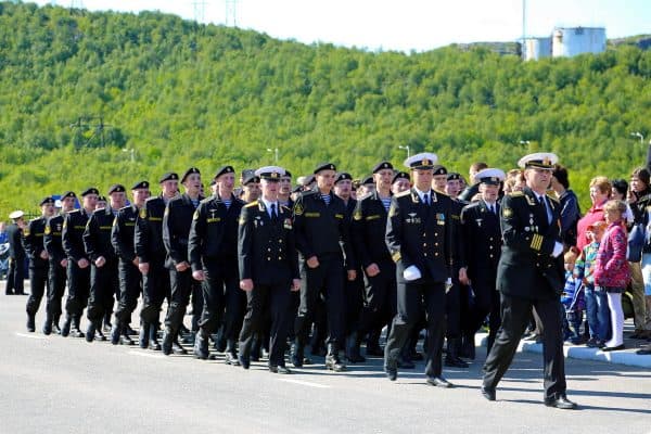 Фоторепортаж с празднования Дня ВМФ в Видяево 26 июля 2015 года — торжественное построение личного состава, посвящённое 50-летию 7-й дивизии АПЛ и Дню ВМФ, поздравления и награждения, конкурс по строевой подготовке и исполнению строевой песни, командные соревнования по перетягиванию каната и гиревому спорту, праздник Нептуна.